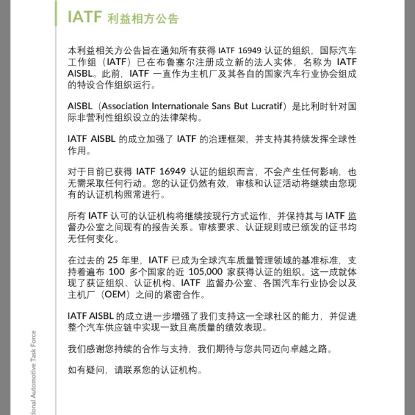 所有更新随后在IATF证书有效性检查(IATF Certificate Validity Check)中可见,可登录IATF全球监督网站查阅: